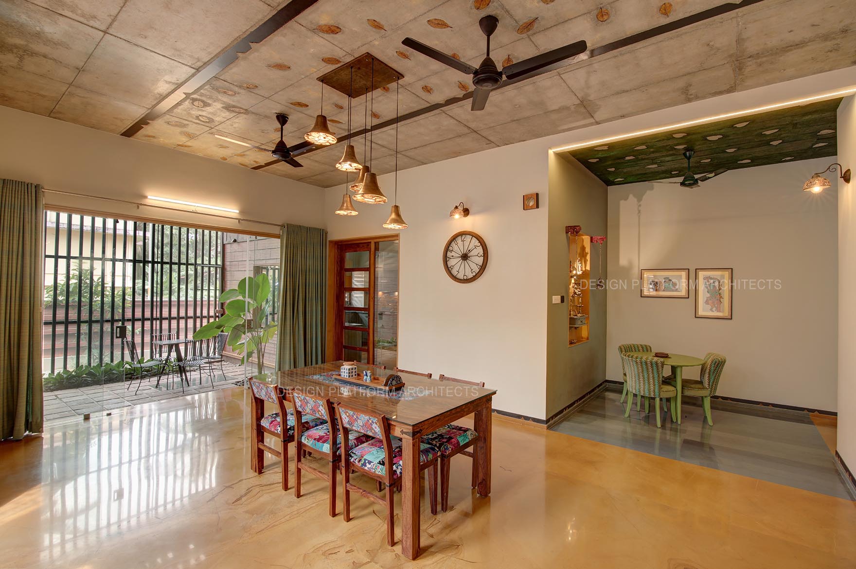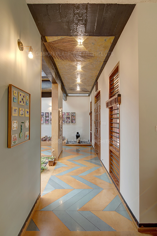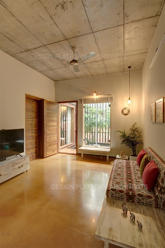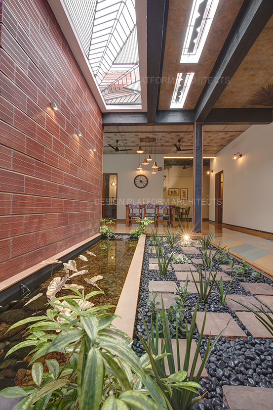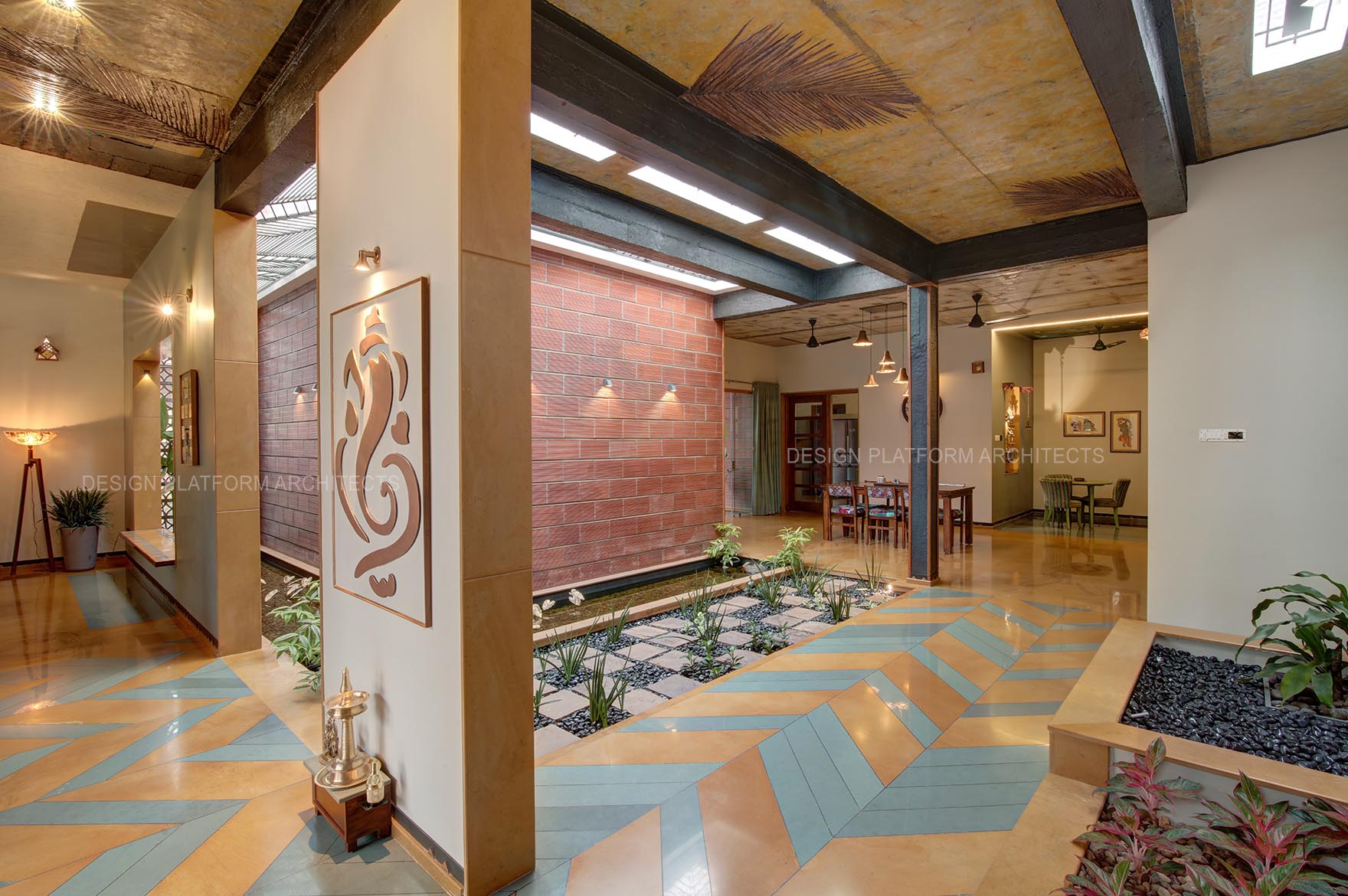 Site has a special character, the neighbourhood context was a temple. The main idea behind the project was how to bring about these character, culture, tradition and adapting the form based on climatic analysis inspired from the temples. The rooms of the house adopt buffer zones inspired from the south indian temples. The movement of the visitor from the busy world cutting across the various buffer zones upto the inner core. Here the inner core symbol (calmness and peace) is symbolised by the central water body.