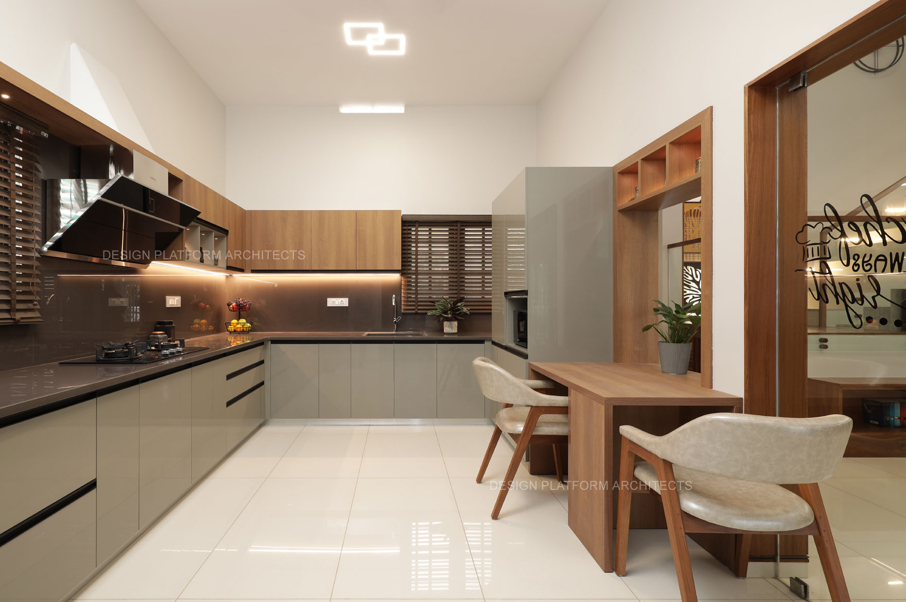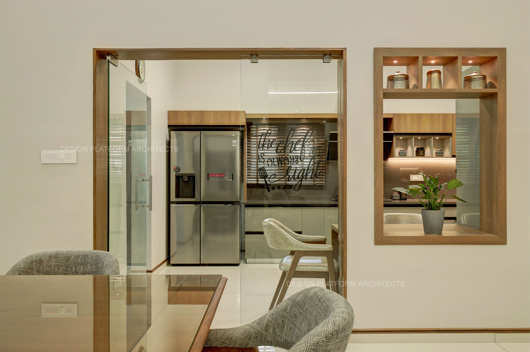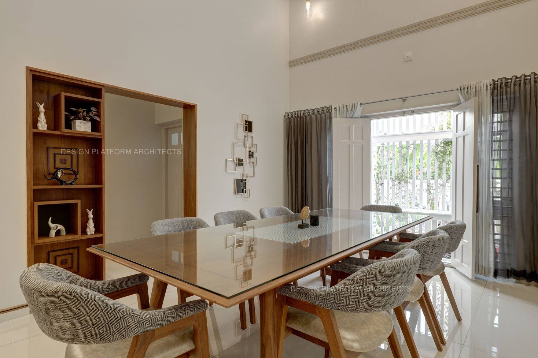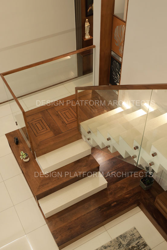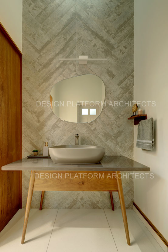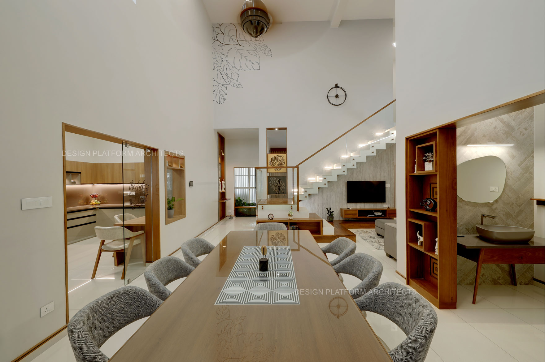 A home speaks about the character who lives in. The project is located in Athirappilly. In the initial stages of site visits we could see extensive growth of bamboos and this was one of the reason to bring in rattan furniture as a design element in the living room. A small garden space is introduced in the powder room along with rustic finish tomsubtle the mood. The staircase is in the centre core of the house hence we had to plan it as a good functional space. The geometric pattern on the dining table is quite exciting by brining the same design element on the chair makes it the reflection of each other.